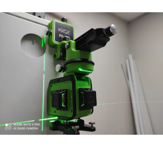 Вертикальные проекции лазерного уровня RGK PR-38G можно расположить почти в упор к стене. Это значительно упрощает выравнивание по углам и обеспечивает точность при штукатурно-отделочных работах и укладке плитки.